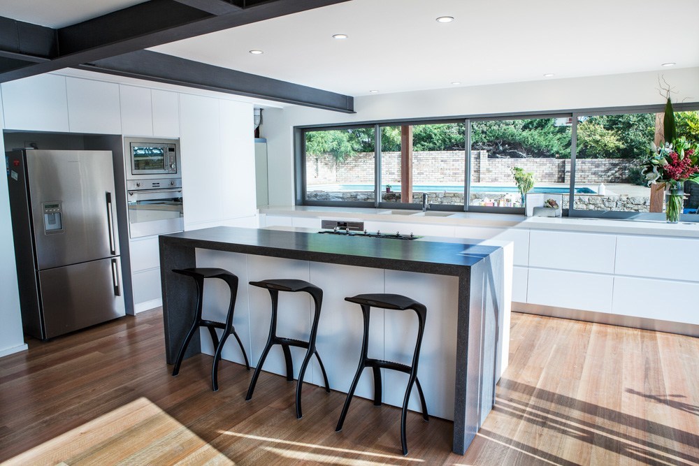 The bench tops have been manufactured in-house from two colours of Corian. Seamless surfaces were manufactured with waterfall design that was laid on top of each other. Choice of stylish, highest quality appliances gave this kitchen and ultra modern finish. Floors were finished with brush box timber, which is a very nice way to finish a great looking kitchen.
