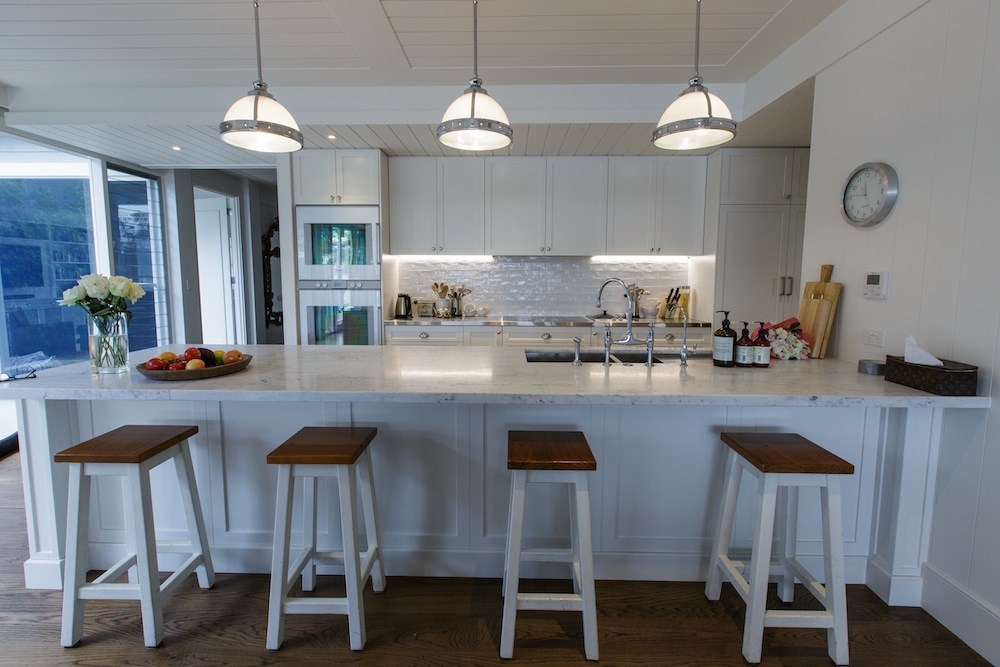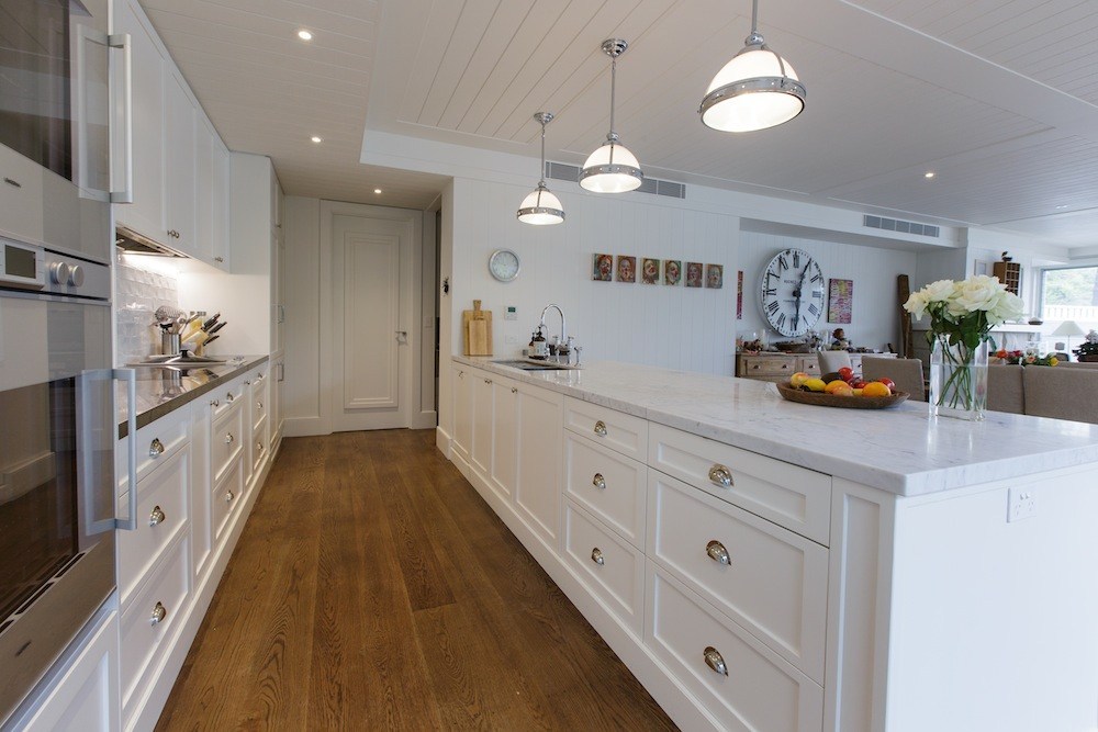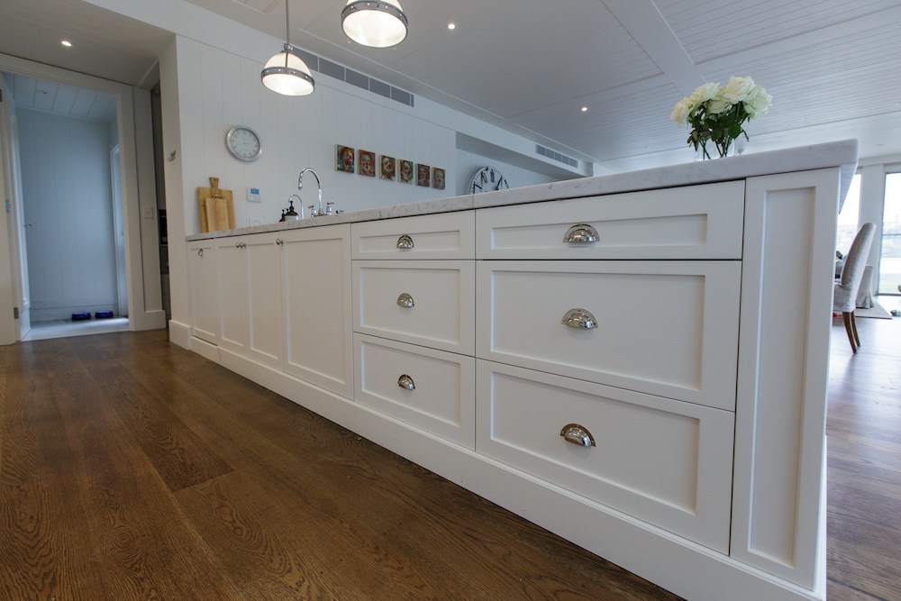 This was a handmade excellence with “Mother of Pearl” handles beautifully incorporated with a seamless look of that kitchen. The pure class “shaker style” doors and panels were hand painted with a clear coating on top for protection. Marble tops even more emphasise the astonishing look of that contemporary room.