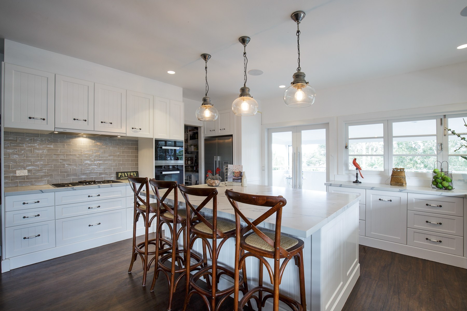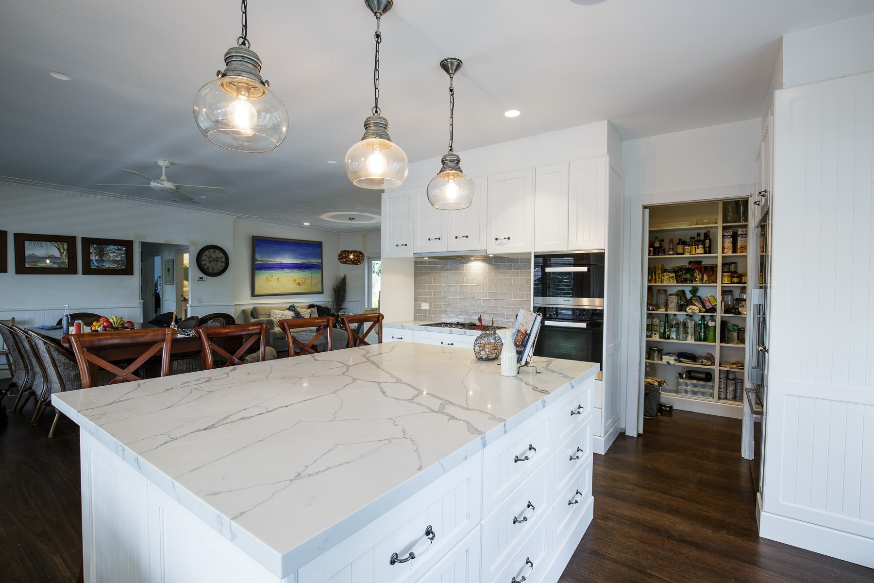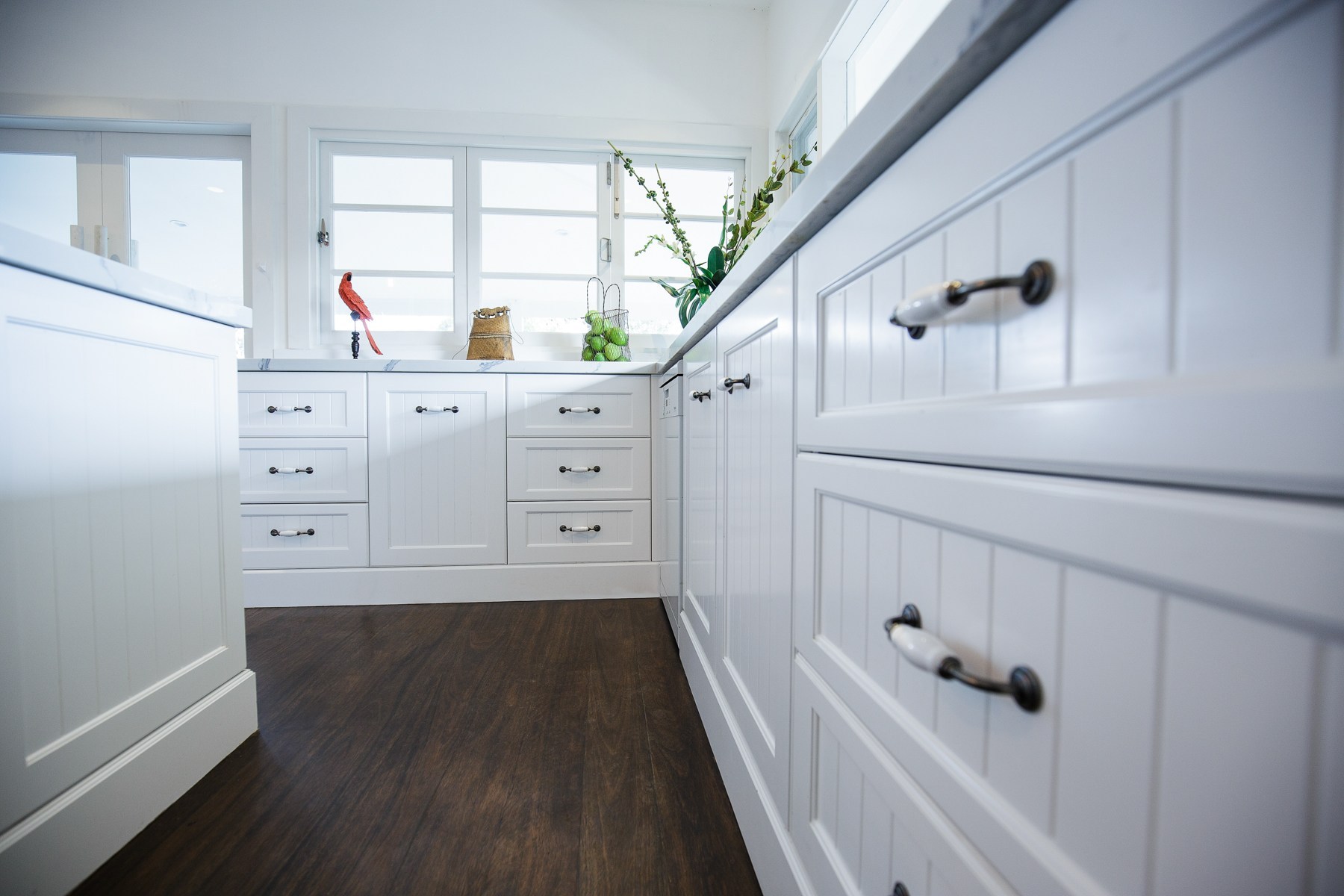 Stunning, modern and luxurious house fitout, with top line materials, polyurethane finishes, designer laminates, soft close hardware and Caesar stone Raw Concrete and Organic White benchtops. All hardware used including soft-close hinges and runners were from major manufacturers such as Blum, Hettich and Hafele.